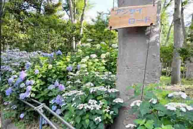 5月にはバラが、6月には「アジサイロード」というアジサイに囲まれた小道にさまざまなアジサイが咲き、秋になると曼殊沙華の花が一面に広がります。