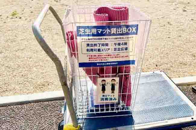 公園の北側には、きれいに整備された芝生が広がっています。芝生の西側の一角は、ワンコも一緒に入れるエリアとなっています。ヨガマットの貸し出しもあり、ワンコと一緒に芝生にゴロゴロすることができます。飲食もOK。ワンコが入っていい場所と、入ってはいけない場所がしっかり決められています。