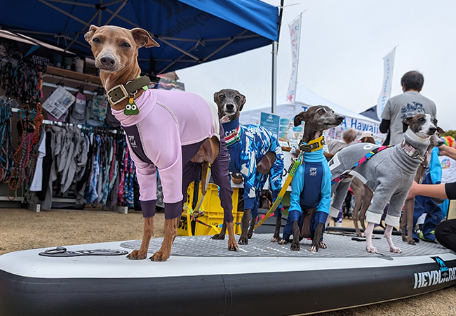 犬にライフジャケットやウェアを着た状態でボードにのっていただき