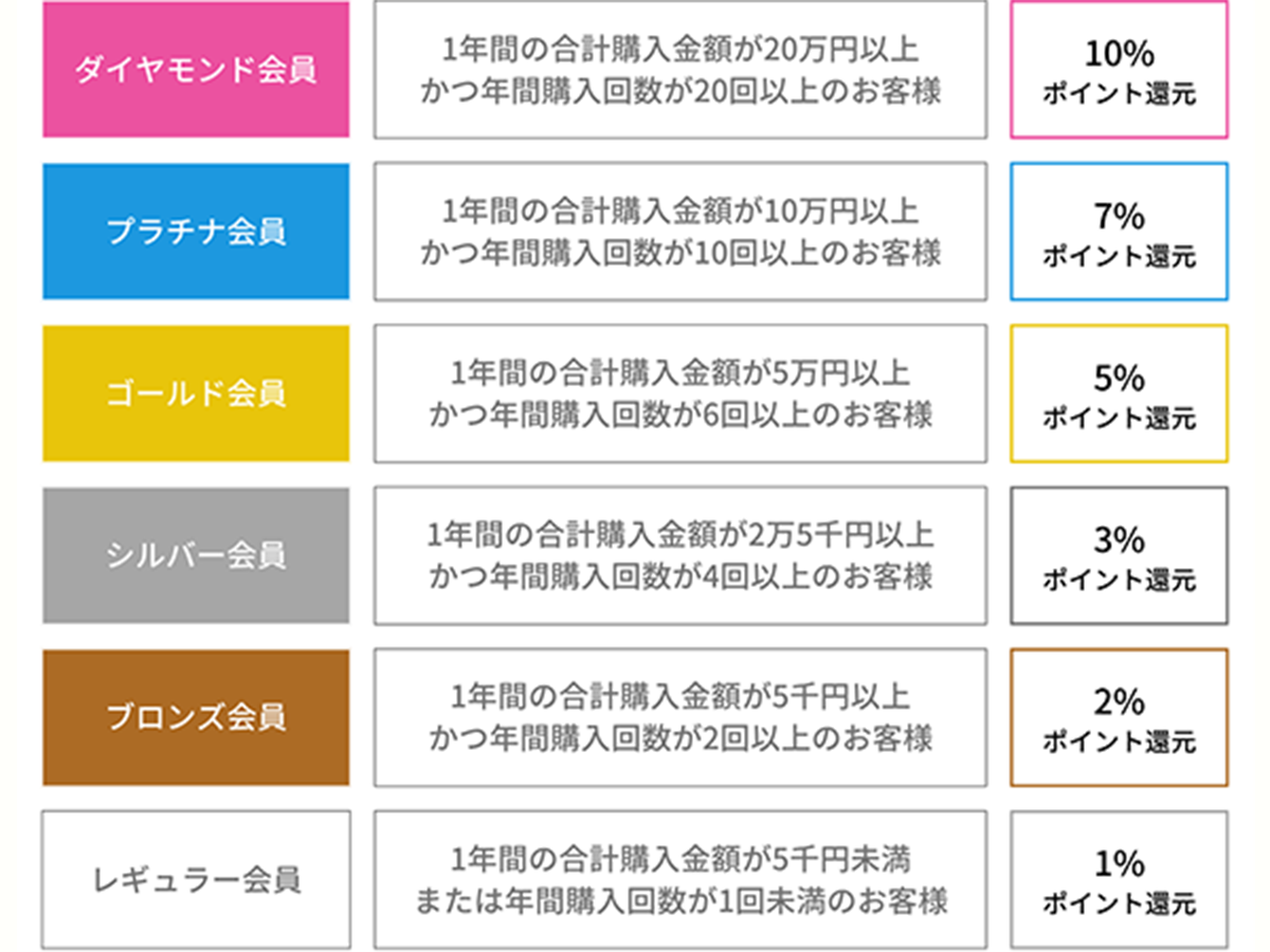 - ●毎年4月から1年間の購入金額(税抜)に応じて会員ステージが更新されます。