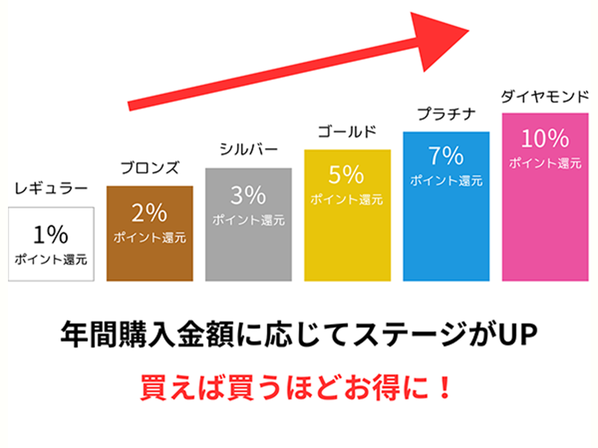 たくさんお買い物をしていただくと、会員ステージがあがっていき、ステージごとにポイント還元率がUP!