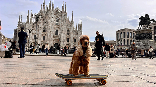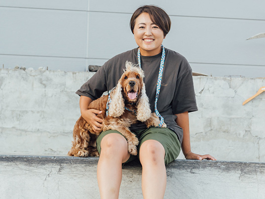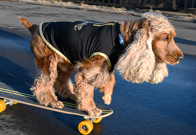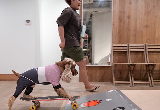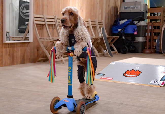 ドッグスクールを運営している浅野様の相棒、イングリッシュコッカースパニエルのCODAくんは、自分で漕いで自分でブレーキまでできるスケボーをはじめ、