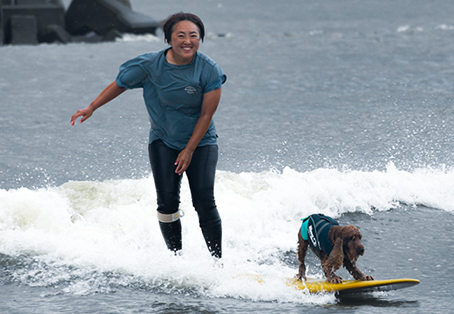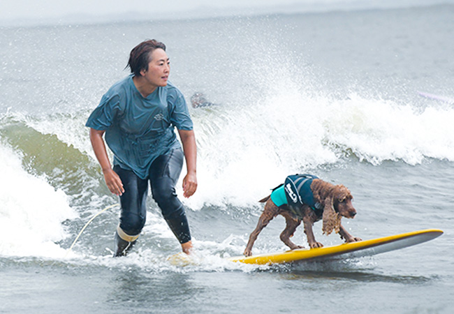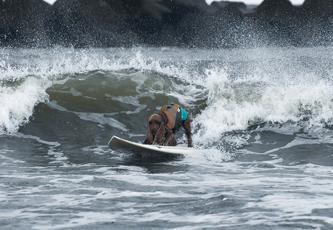CODAくん1頭でのサーフィン、人とのタンデムサーフィン、犬とだけで人は乗らないドッグタンデムサーフィンなど陸や海など様々なフィールドで特技を持つスーパー犬です。