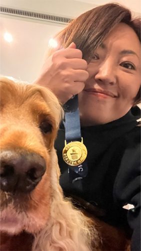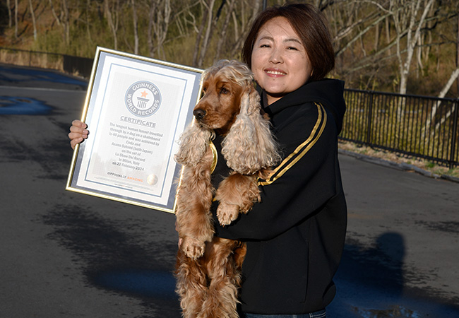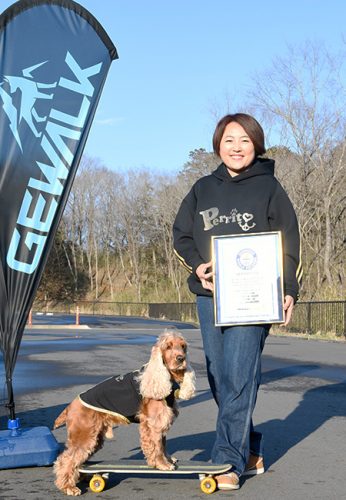 40人の足の間をスケボーでくぐる犬と言うチャレンジで、世界一のスケボー犬になって金メダルと賞状を貰えたそうです。