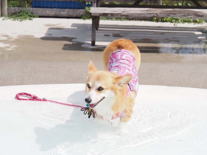 シャワーは、犬は全身、特にコーギーは腹下(笑)、人間はお水につかる膝より下を、必ずシャワーしましょう。また、水に濡れてOKの履物を必ず持参しましょう。