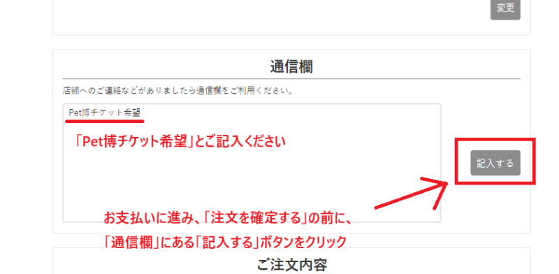 ②購入手続きの際に、通信欄に「Pet博チケット希望」と記入をお願い致します。