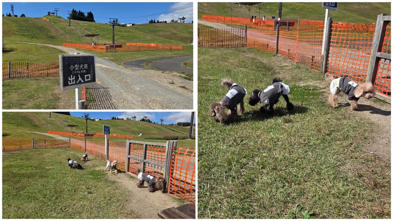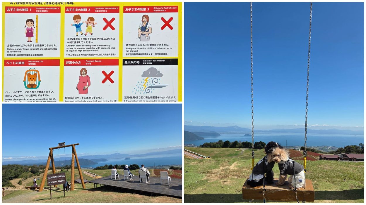 6メートルの高さがある「ブランコ」へは、リフトに乗って行くのですが、ワンコは貸し出してくれるクレートにインして、座席に乗せるので、我が家は2頭ずつに分けて乗りました。