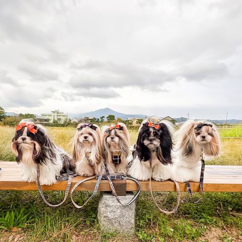 大好きなgemelliさんのチェックのカラー、ハーネス、リーシュで5ワンコおそろいでお散歩へ!!お揃い最強にかわいい!!