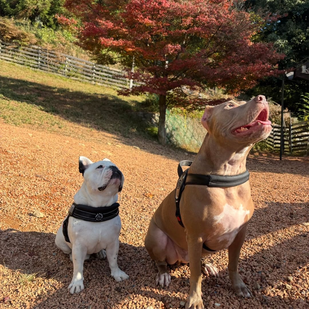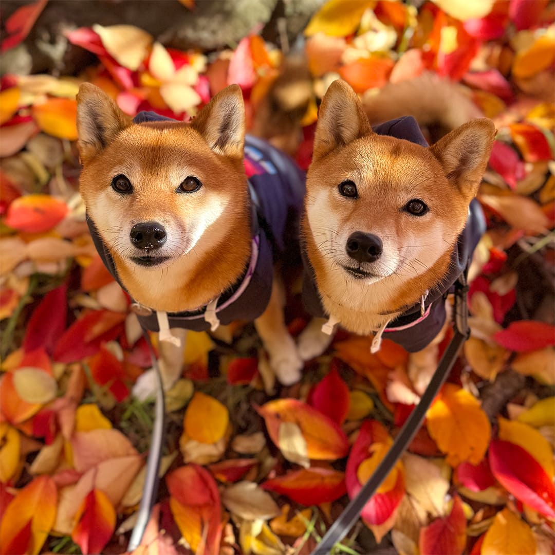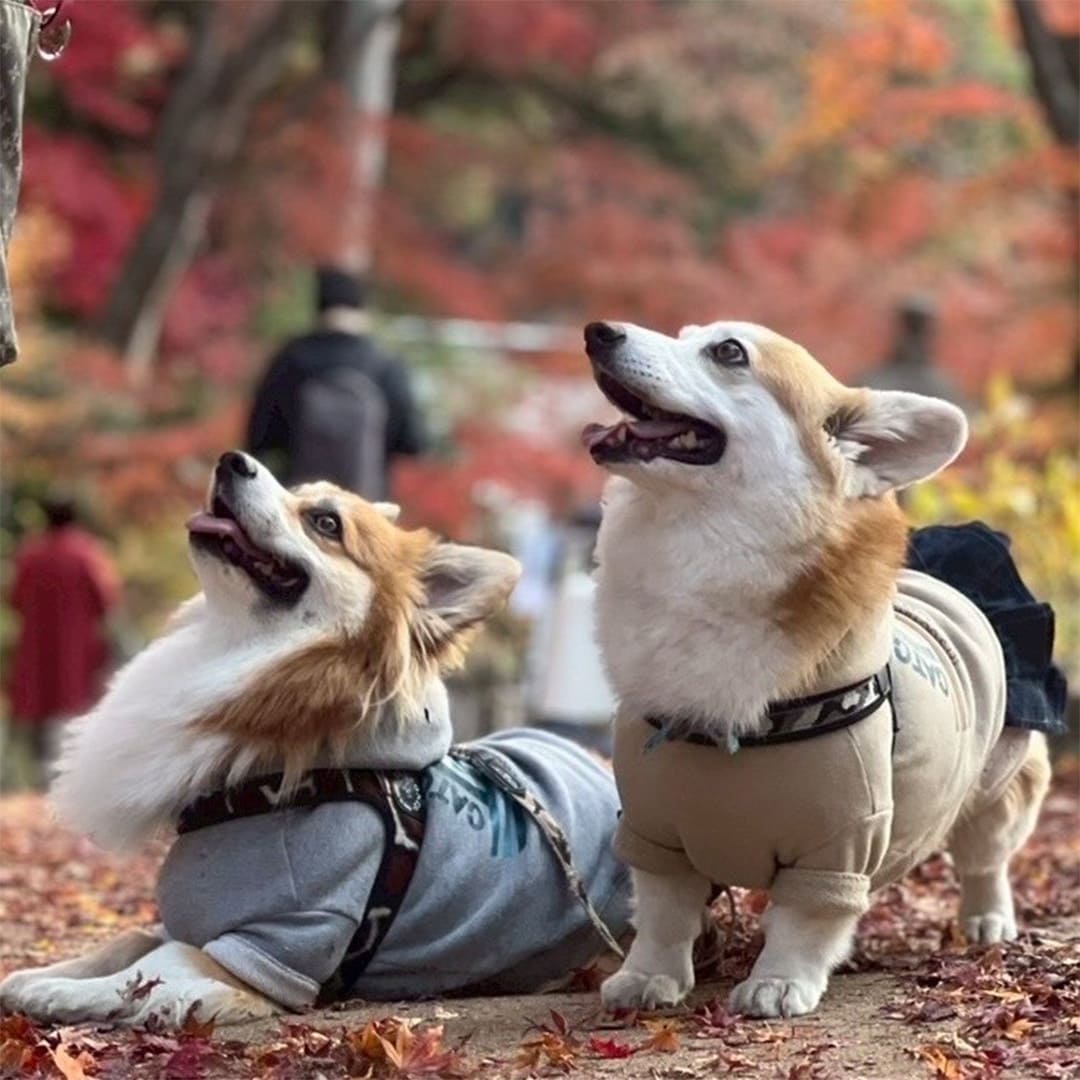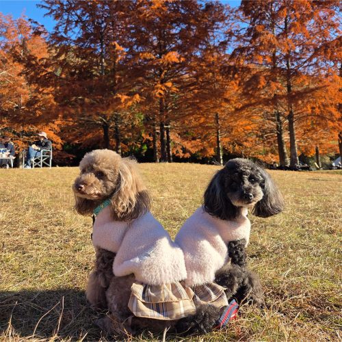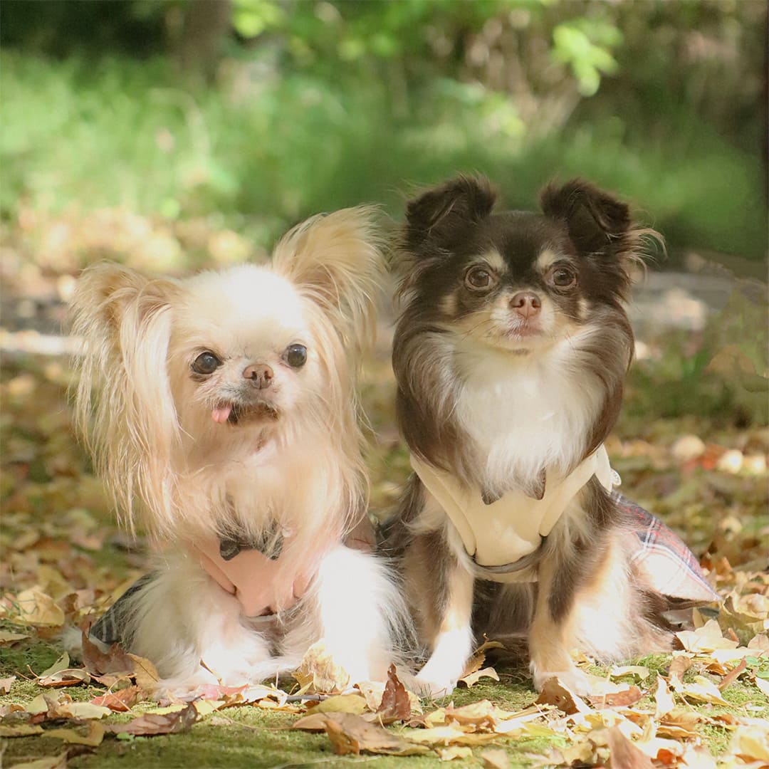 2人お揃いのワンピースとハーネスを付けて近所のお気に入りの公園へお散歩に行った時のお写真です 落ち葉が沢山で秋らしい景色の中のんびりとお散歩を楽しみました
