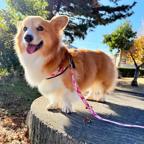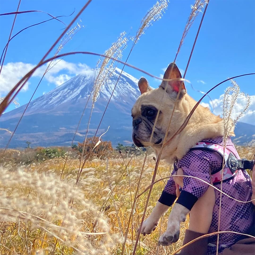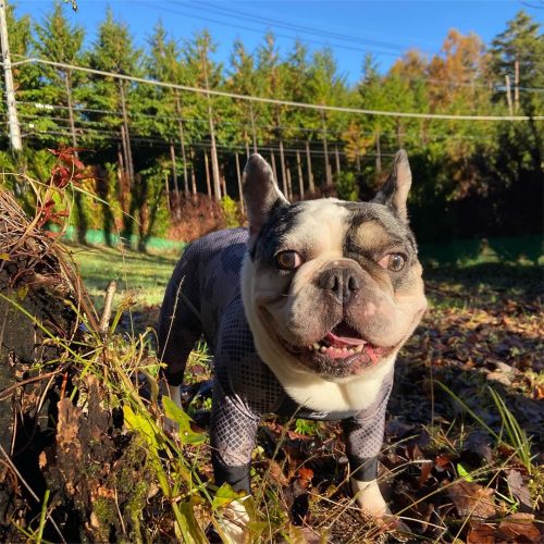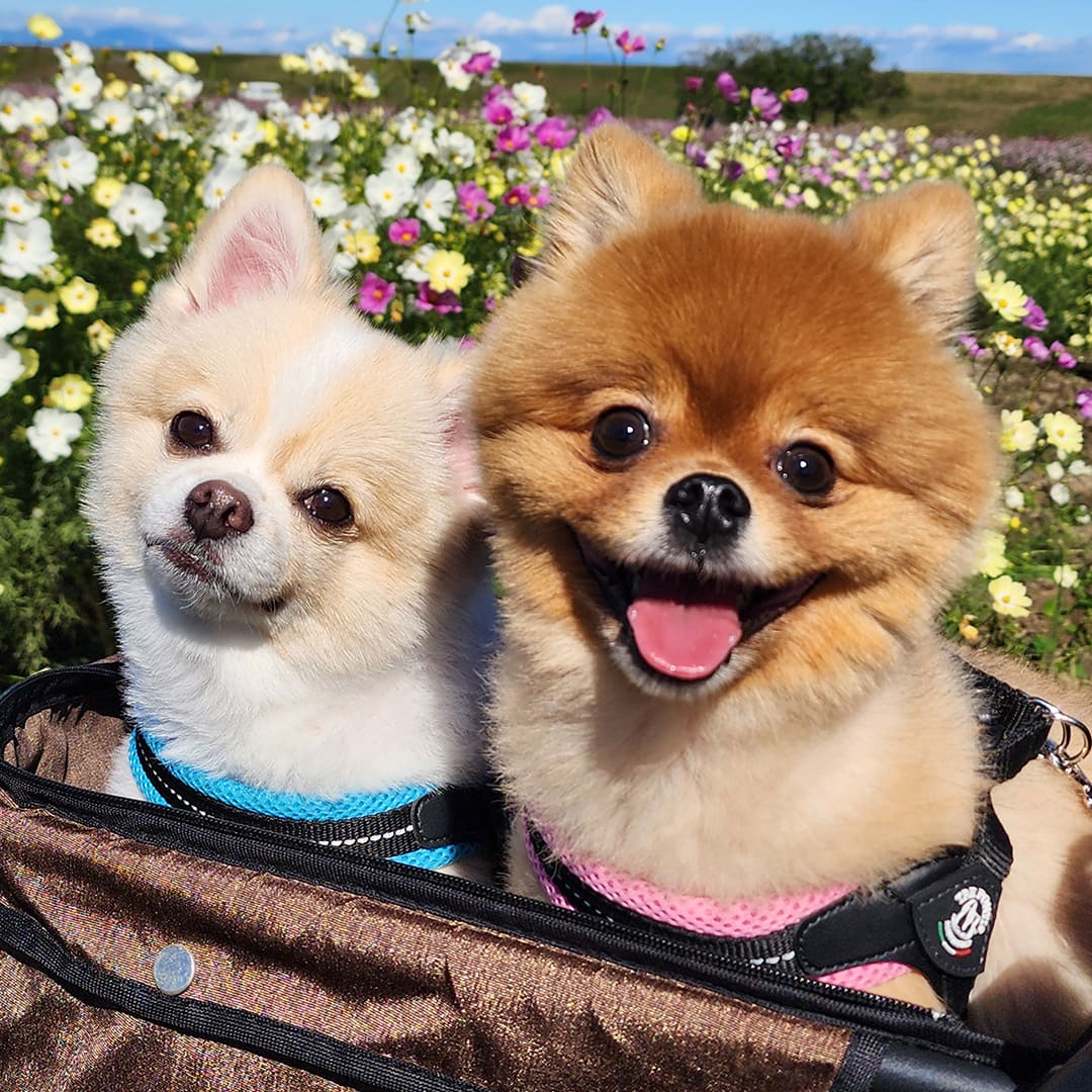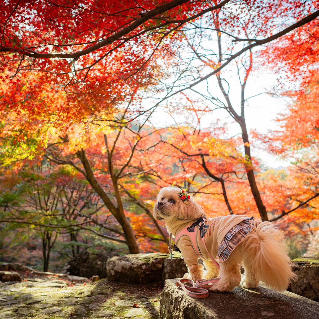 2人お揃いのワンピースとハーネスを付けて近所のお気に入りの公園へお散歩に行った時のお写真です 落ち葉が沢山で秋らしい景色の中のんびりとお散歩を楽しみました