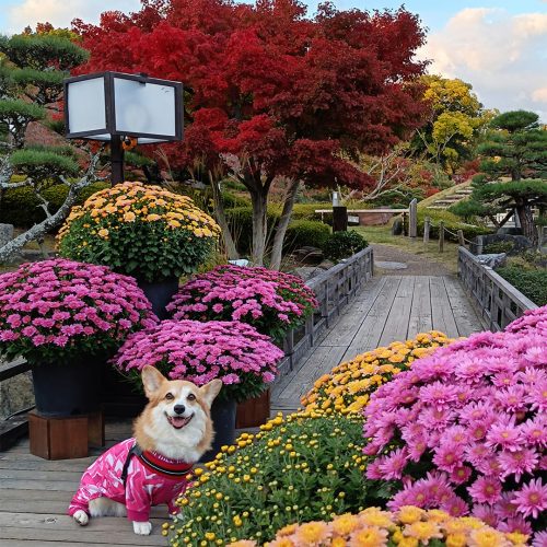 いつもお散歩で行くしあわせの村の日本庭園で撮影しました。紅葉もちらほら、大きなな池の真ん中にデッキがあって見事な菊が咲いています。