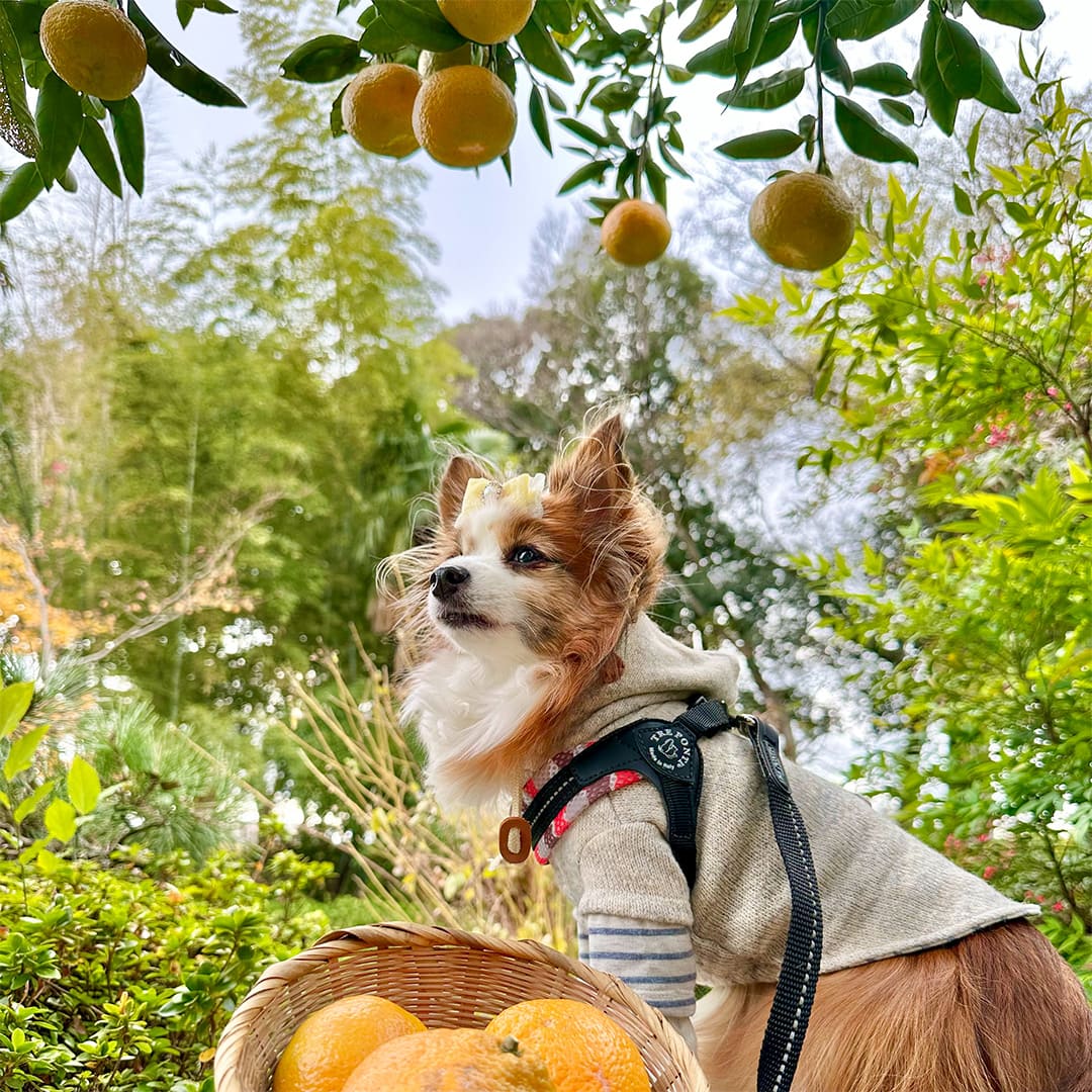 大きな実を付ける境内のみかんの木。収穫のお手伝いをしたRaRaちゃん。ちょっぴり黄昏れた横顔が素敵!