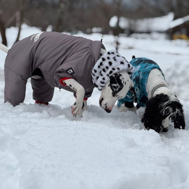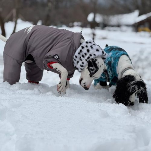 鳥取の大山のふもとのコテージ前で雪遊びするベラとリック。 積雪量は1mをはるかに超える積雪の中2人は何か宝探しでもしているかのように雪掘りをして遊んでいました。 GEWORKの服は伸縮性があり動きやすさ抜群な為、服を着ていても気にせずに走り回っていました