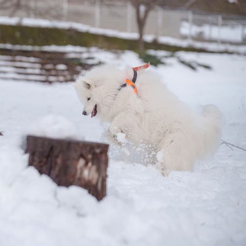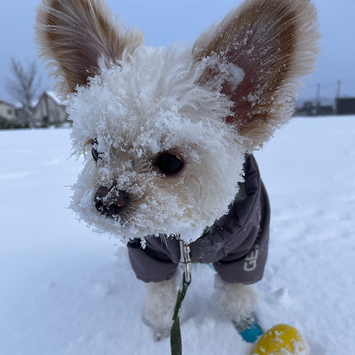 大好きなひよこのおもちゃを追いかけて雪まみれに。寒がりなインドア派ですが、相棒ピヨちゃんとだったら頑張れるようです。